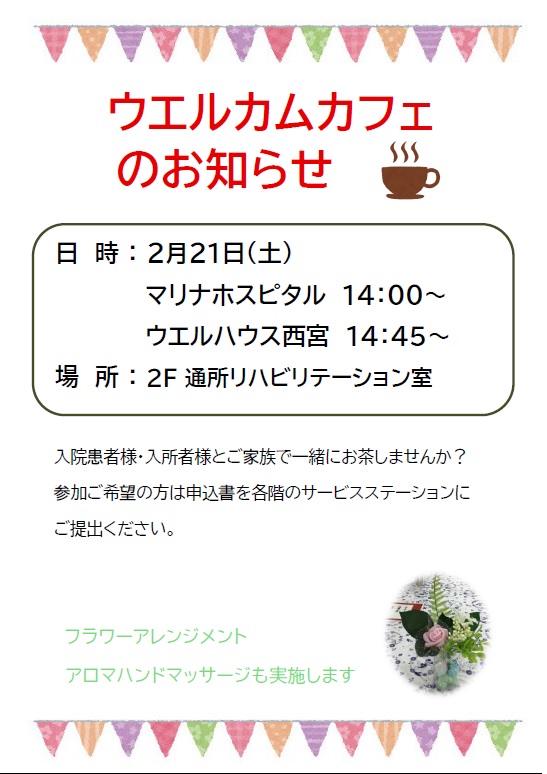 HOME » お知らせ一覧 » お知らせ » ウエルカムカフェ(2026年2月21日開催) ウエルカムカフェ(2026年2月21日開催) 公開:2026/02/13 協和マリナホスピタルとウエルハウス西宮のそれぞれで、ウエルカムカフェを開催します。 入院患者様・入所者様とご家族で一緒の時間を過ごしていただきます。 日程 2026年2月21日(土) 時間 協和マリナホスピタル 14:00 ~ ウエルハウス西宮 14:45 〜 場所 協和マリナホスピタル・ウエルハウス西宮 2階リハビリテーション室 参加ご希望の方は、申込書を各階のサービスステーションにご提出ください。
