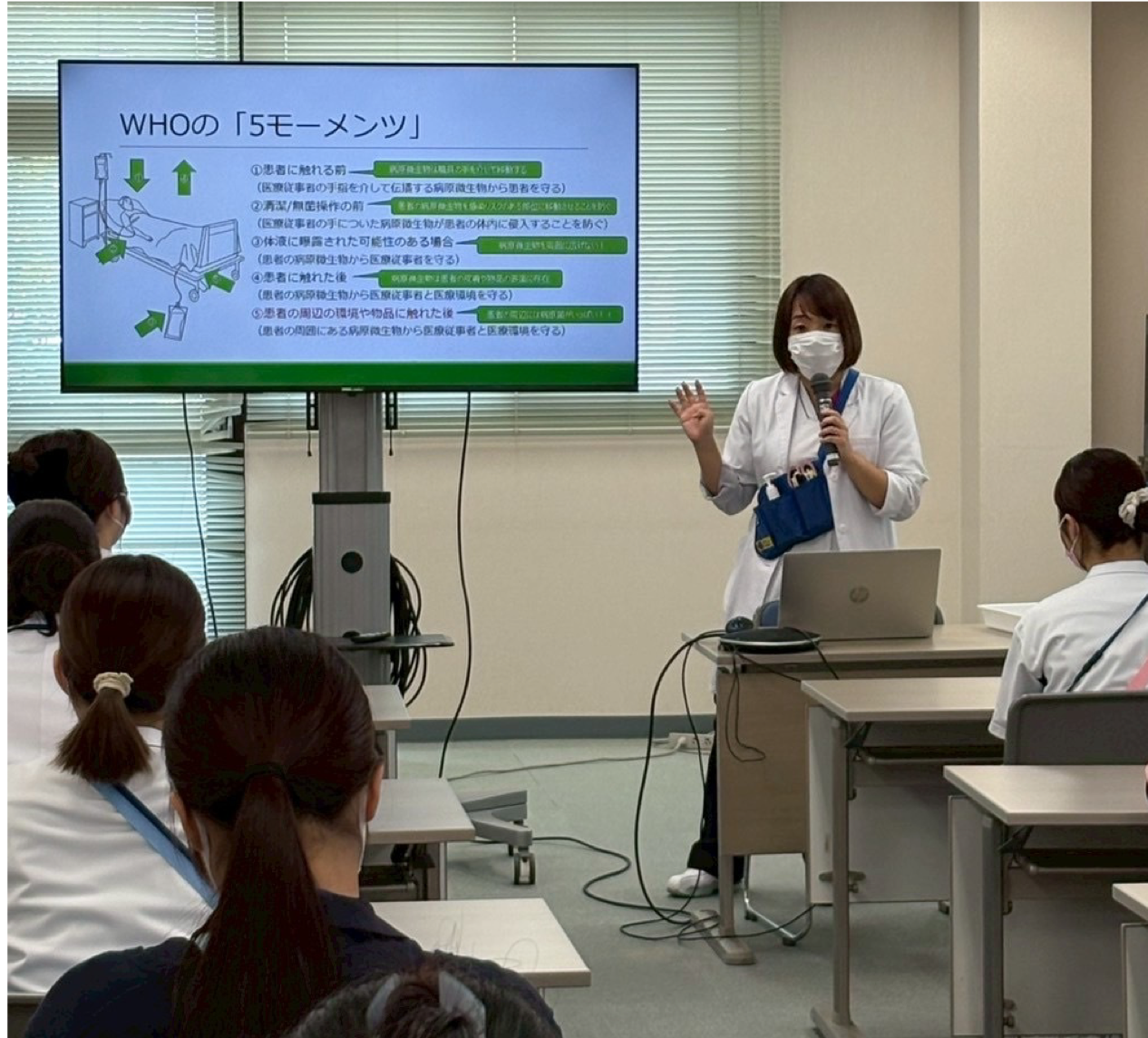 「耐性菌のキャラクターを知ろう」をテーマに感染制御認定薬剤師から新入職スタッフへ勉強会を開催し、メチシリン耐性黄色ブドウ球菌(MRSA)などの代表的な耐性菌の特徴や、感染を拡げないための予防策をお伝えしました。
