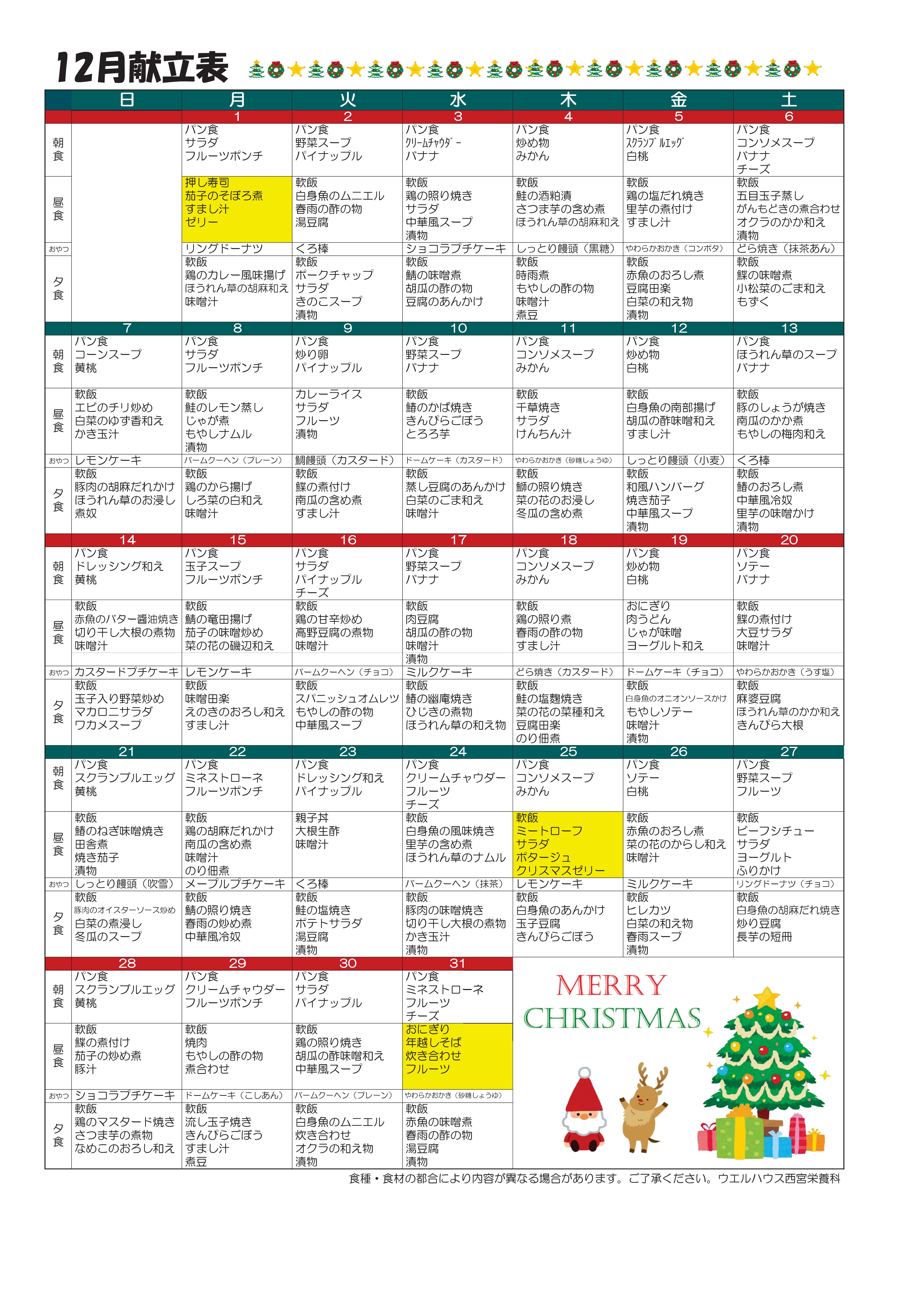 HOME » お知らせ一覧 » サービス内容 » お食事について » 2025年12月のお食事予定表(入所者様の献立表) 2025年12月のお食事予定表(入所者様の献立表) 公開:2025年12月 1日